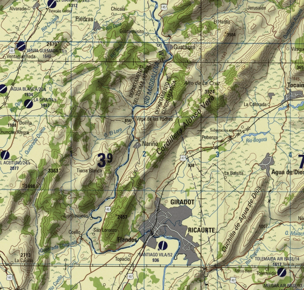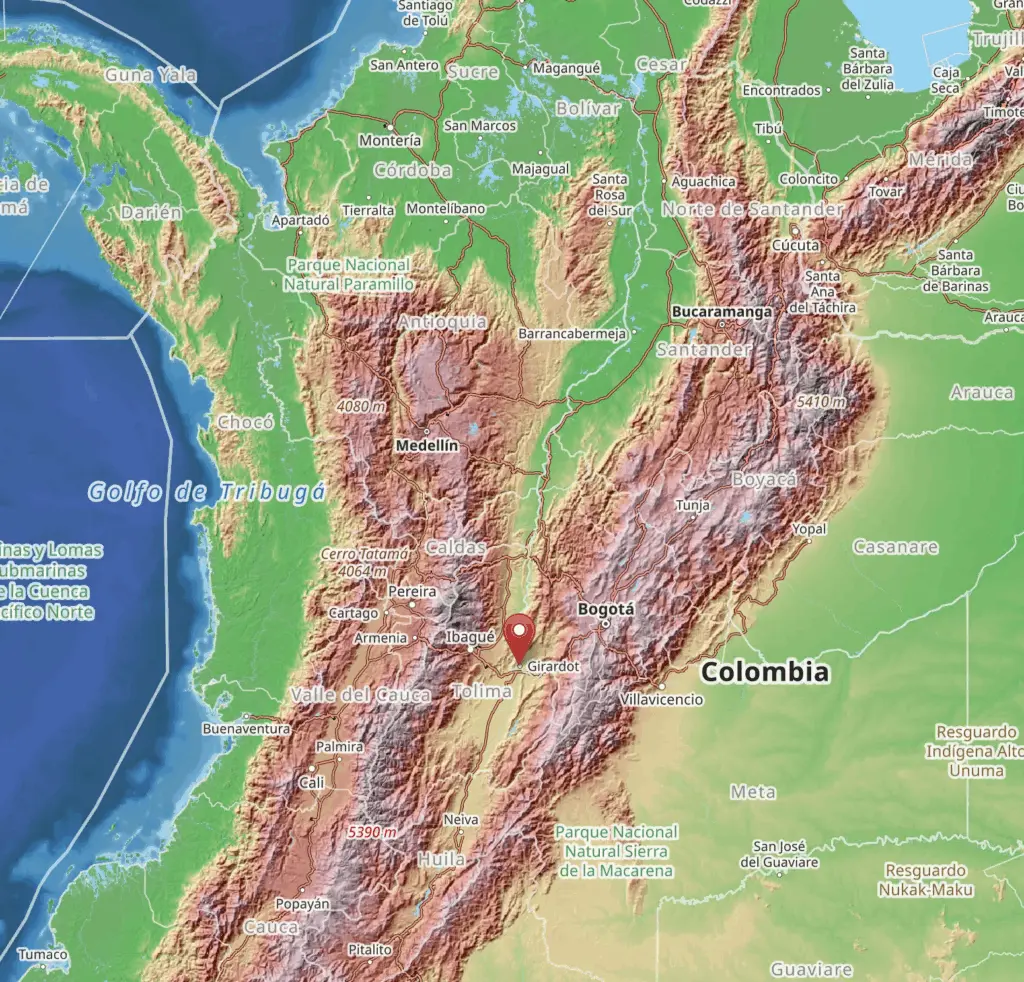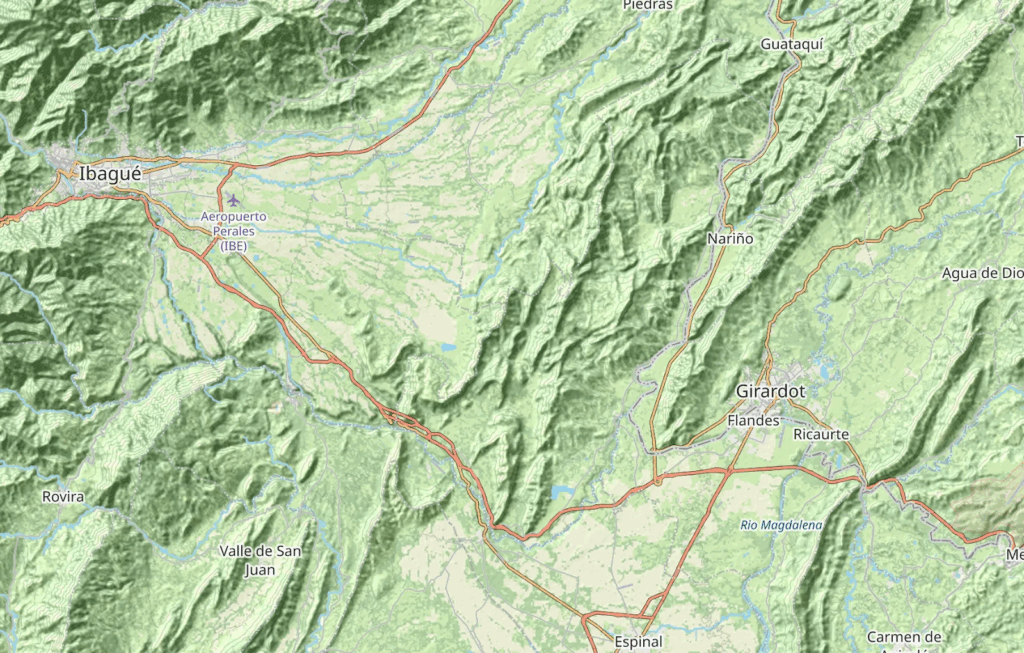 As an example, I had wanted to label a range of hills between Ibagué and Girardot in the department of Tolima, directly east of the Chocó (marked below)