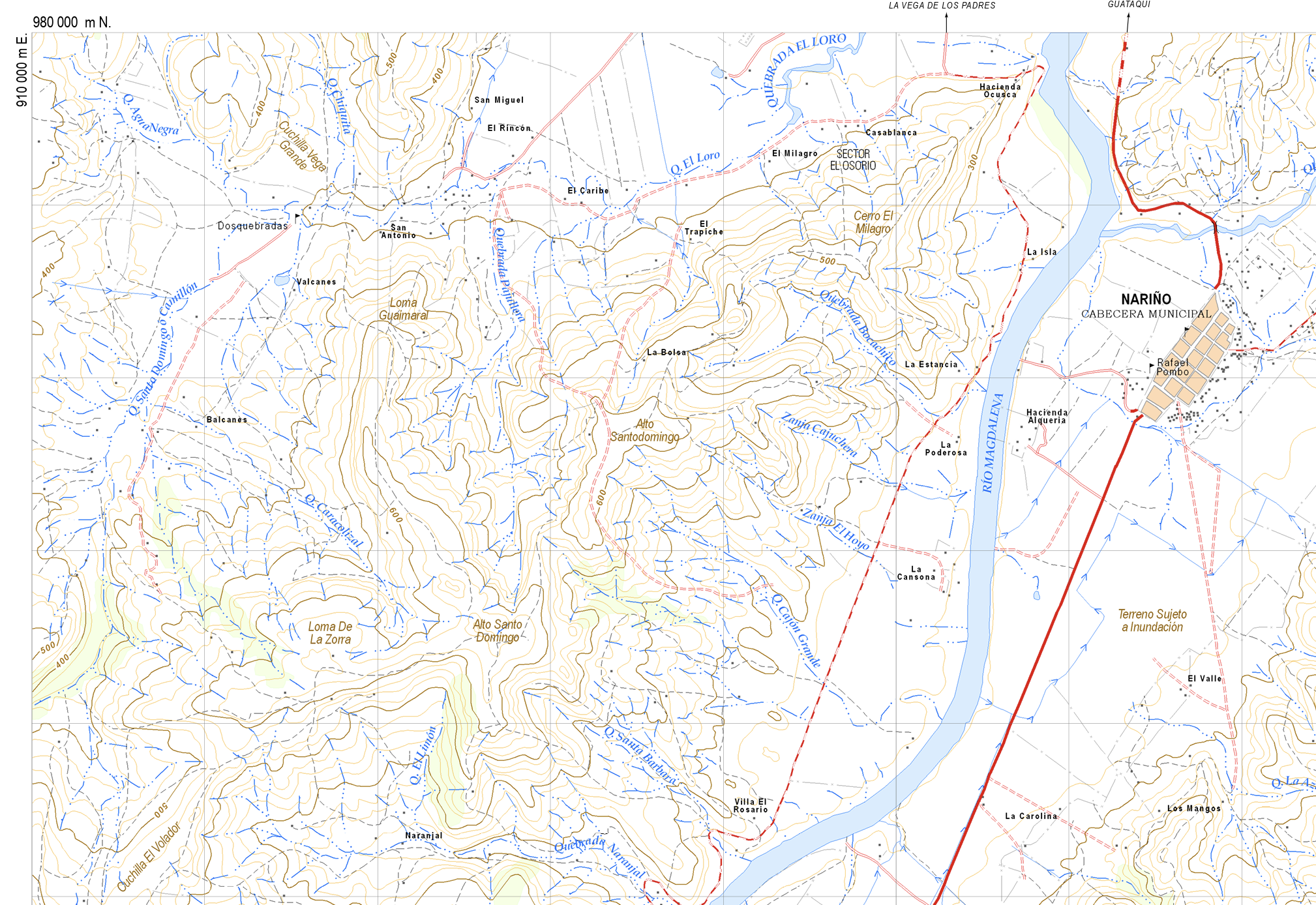 The most recent official Colombian topo maps are too small-scale to be useful, and again show only highly detailed geographic features: